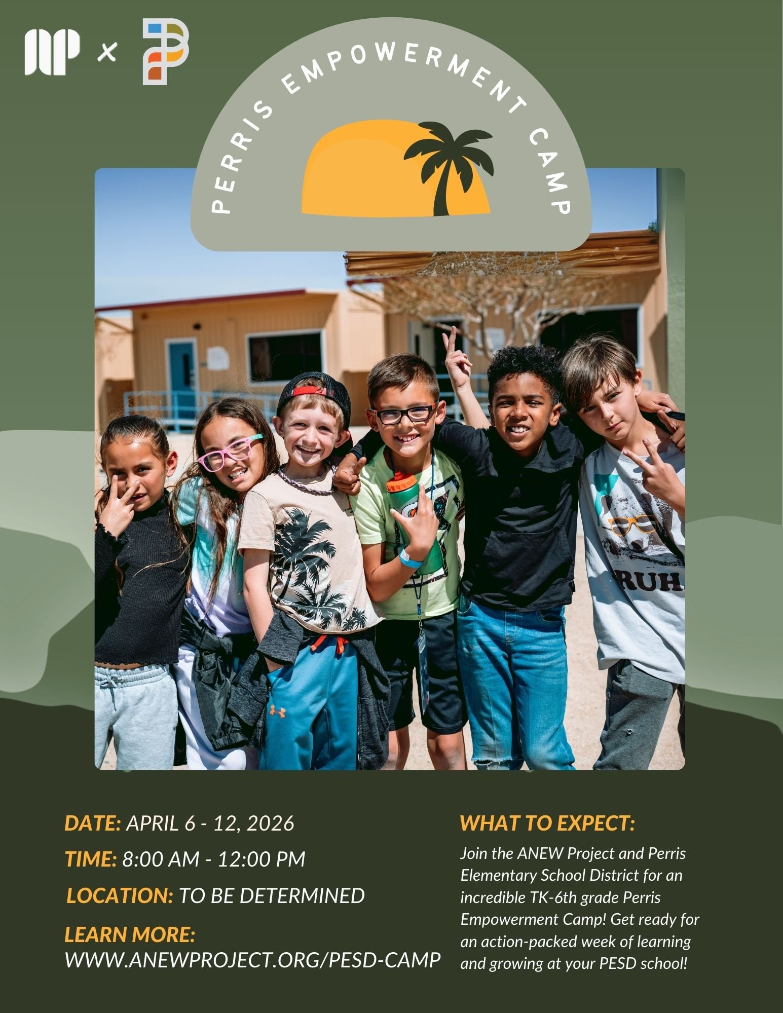 Join Perris Elementary School District and the ANEW Project for an incredible TK-6th grade Perris Empowerment Camp! Get ready for an action-packed week of learning and growing at your PESD school! The ANEW Project is bringing excitement with fun and engaging activities designed especially for TK-6th graders who are eager to develop their leadership potential.