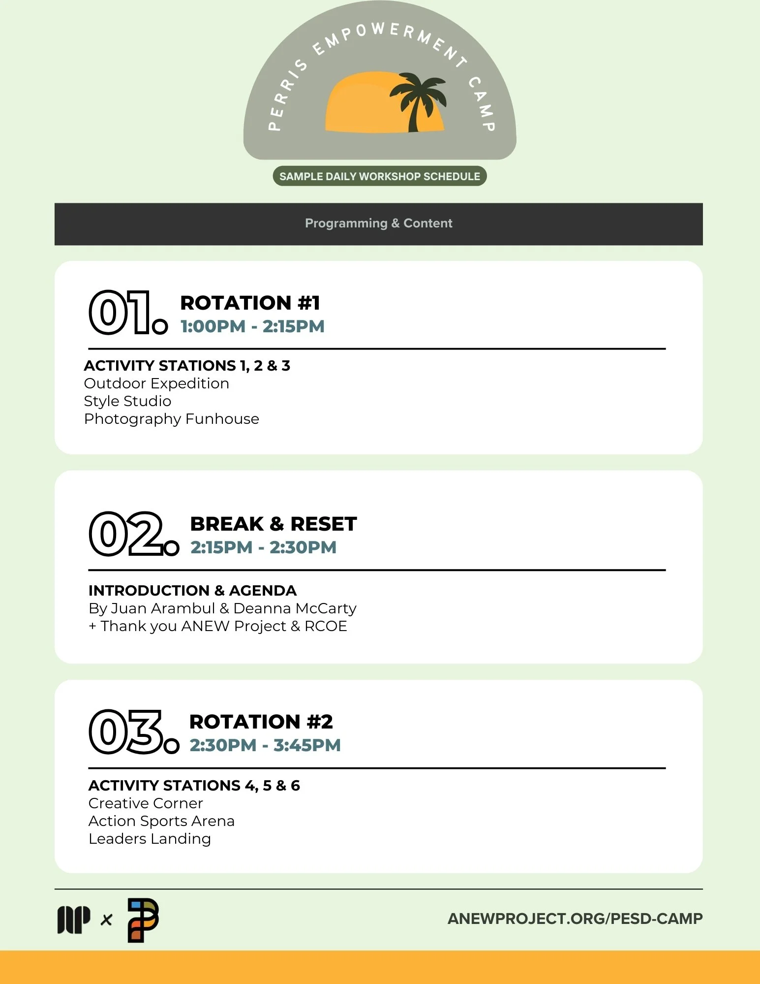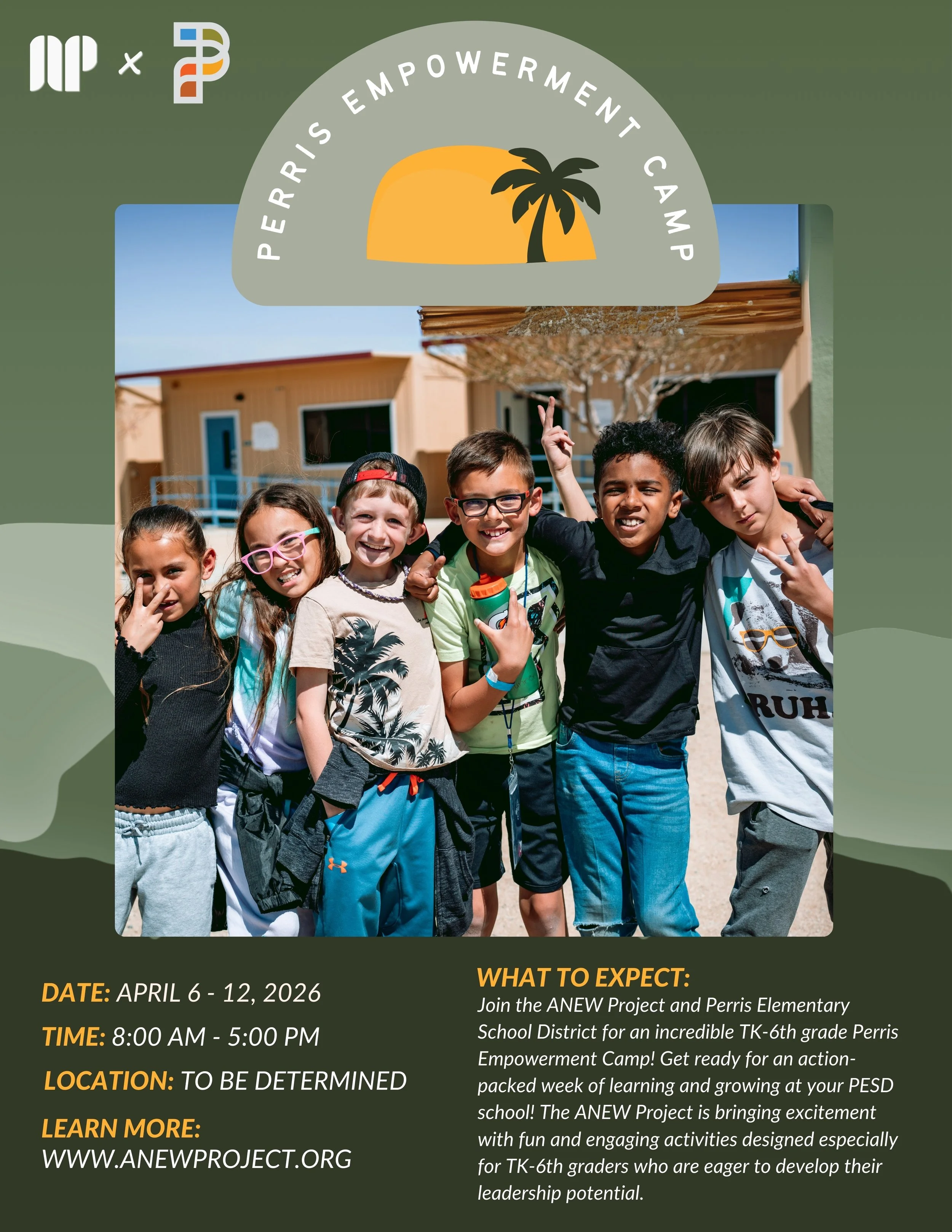 Join Perris Elementary School District and the ANEW Project for an incredible TK-6th grade Perris Empowerment Camp! Get ready for an action-packed week of learning and growing at your PESD school! The ANEW Project is bringing excitement with fun and engaging activities designed especially for TK-6th graders who are eager to develop their leadership potential.